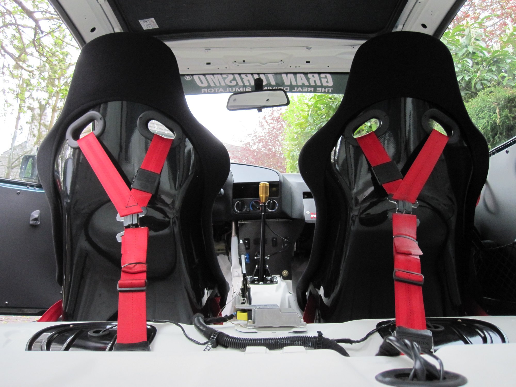 Beim Kauf waren die Pole Positions auf Laufschienen und L-Adaptern von Recaro montiert. Dadurch saß man tatsächlich genau so hoch wie mit Originalsitzen (null Platz für Helm) und auch nicht mittig (da wäre auch zur Tür hin kein Platz für den Käfig gewesen). Daher sind die rausgeflogen und ich habe mir Raceparts Sitzkonsolen gekauft. 100% mittig sitzt man auch damit nicht, aber viel tiefer.
