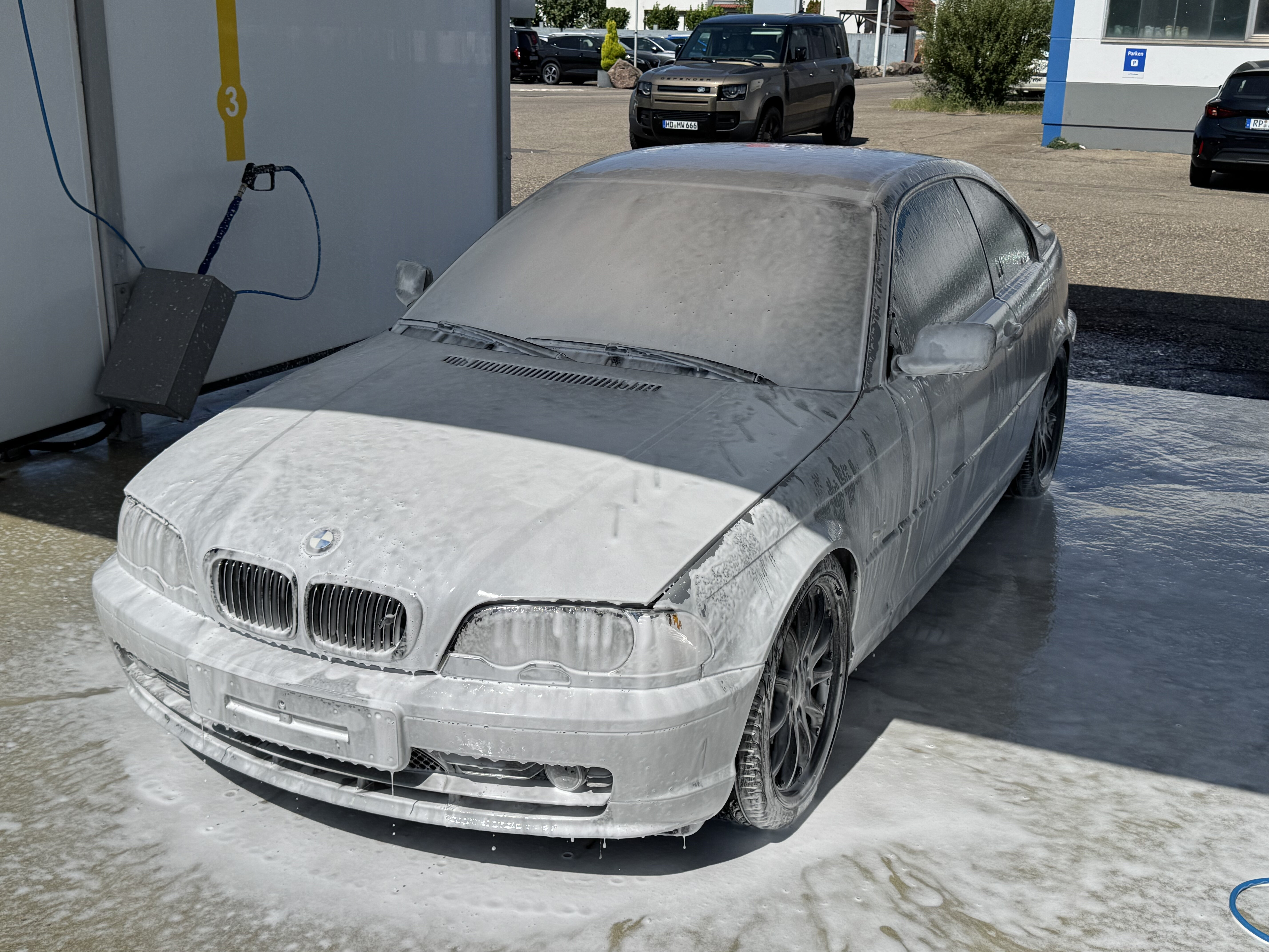 Anbei mal einige Fotos von gestern, als wir den BMW aus der Garage holten, eine intensive Grundreinigung durchführten und in unsere Schrauberhalle stellten.